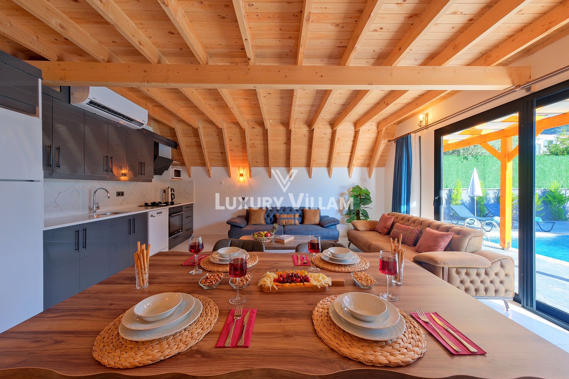 Dış Mekan Keyfi: Geniş veranda, özel barbekü alanı, jakuzi ve havuz manzaralı oturma grubu.