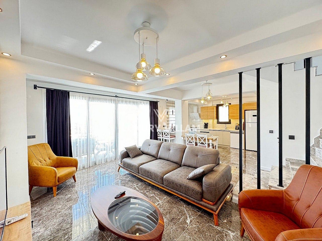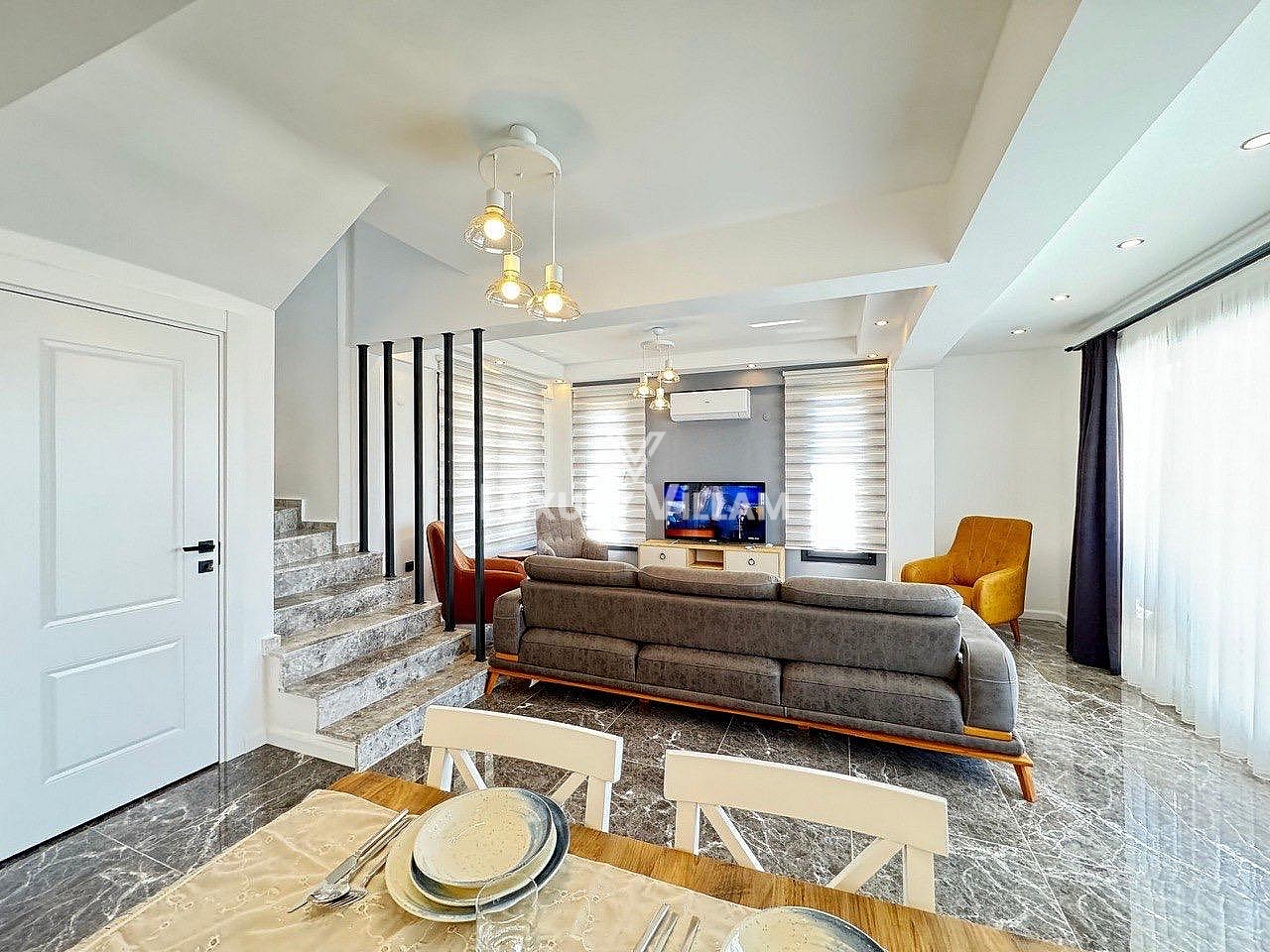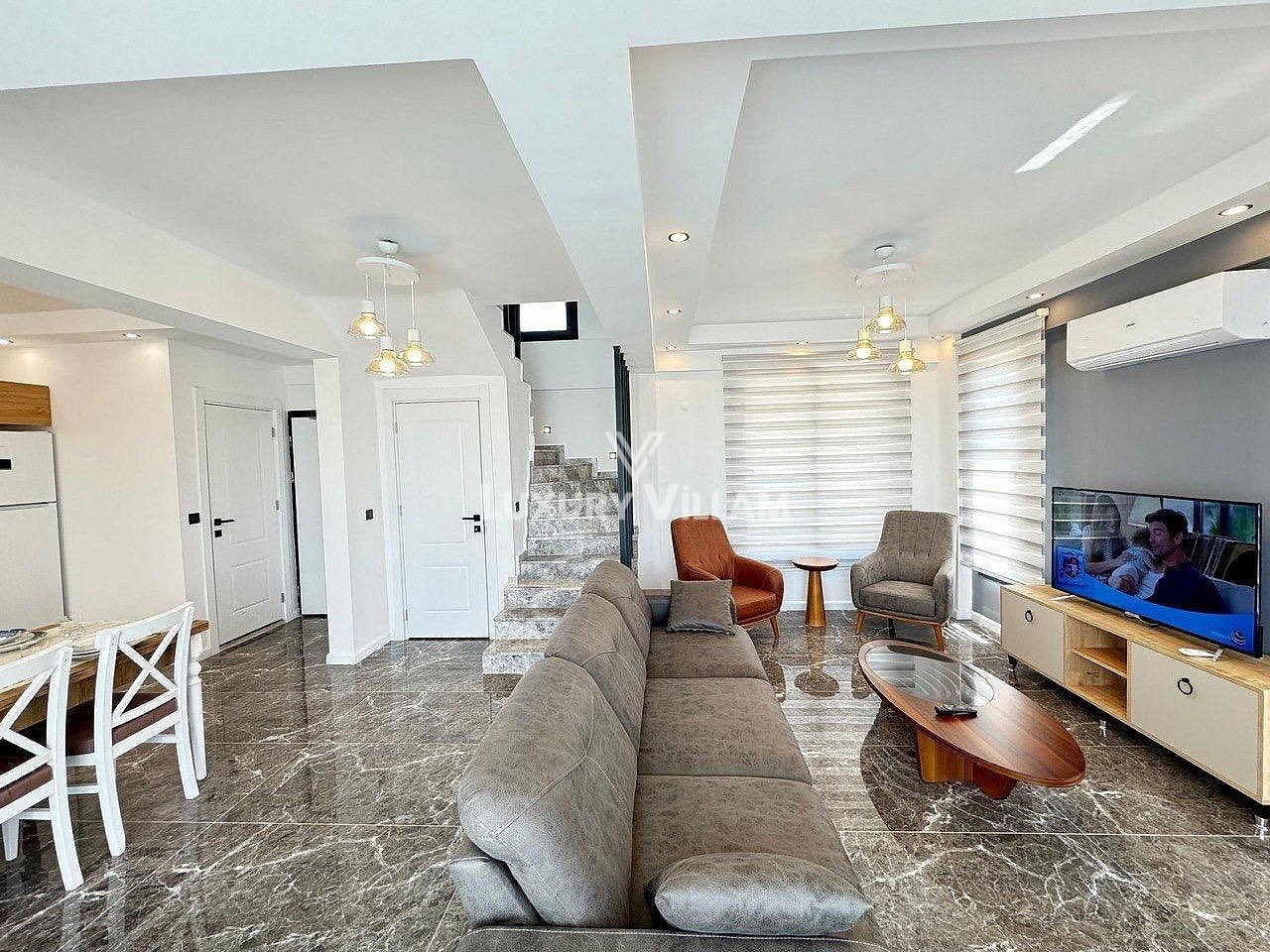Salon: Özenle döşenmiş açık mutfaklı salon, modern koltuklar, yemek masası, TV, klima ve WC bulunmaktadır.