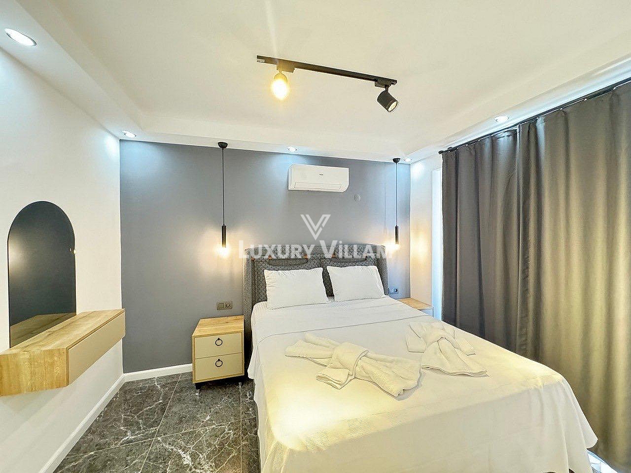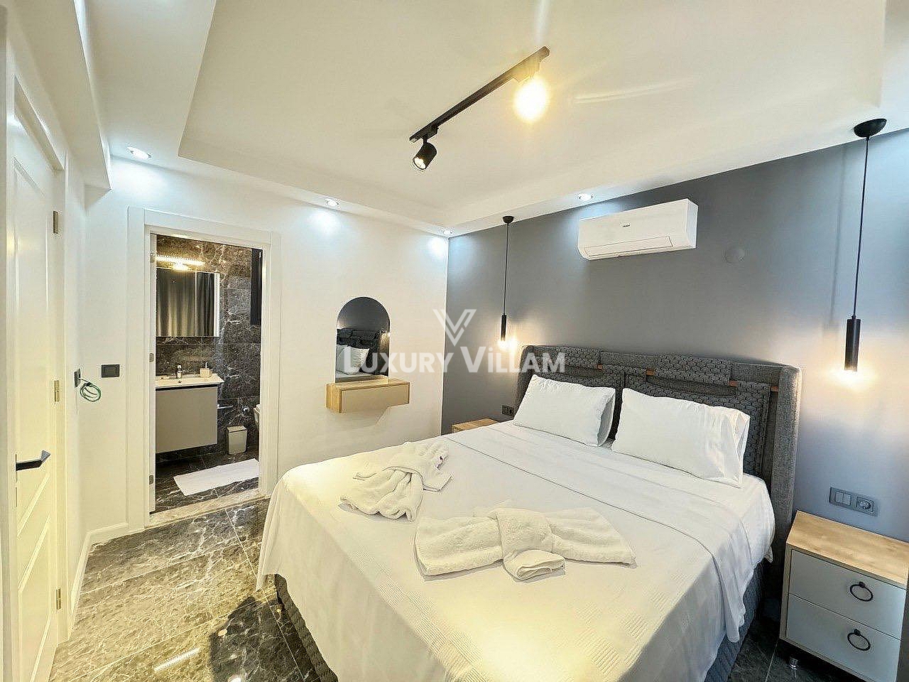 1.Yatak odası: Çift kişilik yatak, ebeveyn banyosu, klima, giyinme odası ve elbise dolabı bulunmaktadır.