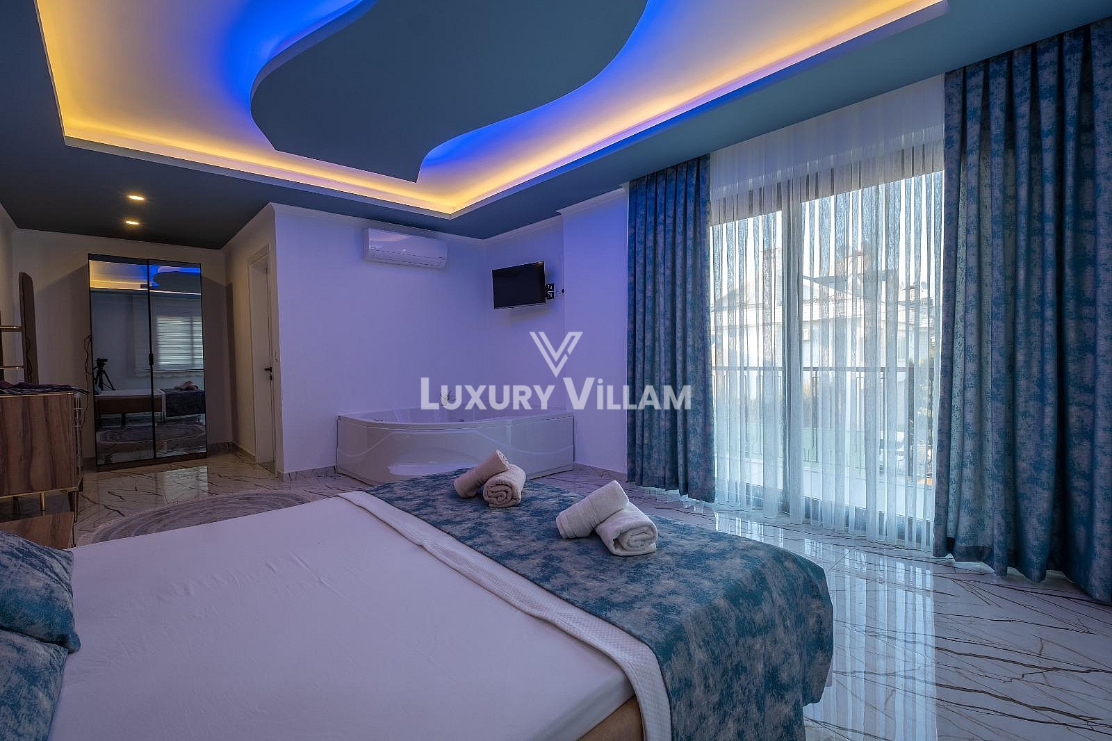 1. Yatak Odası : 1 Adet Çift Kişilik Yatak, Elbise Dolabı, Televizyon, Komidin, Ebeveyn Banyo, Makyaj Aynası, Balkon ve jakuzi bulunmaktadır.