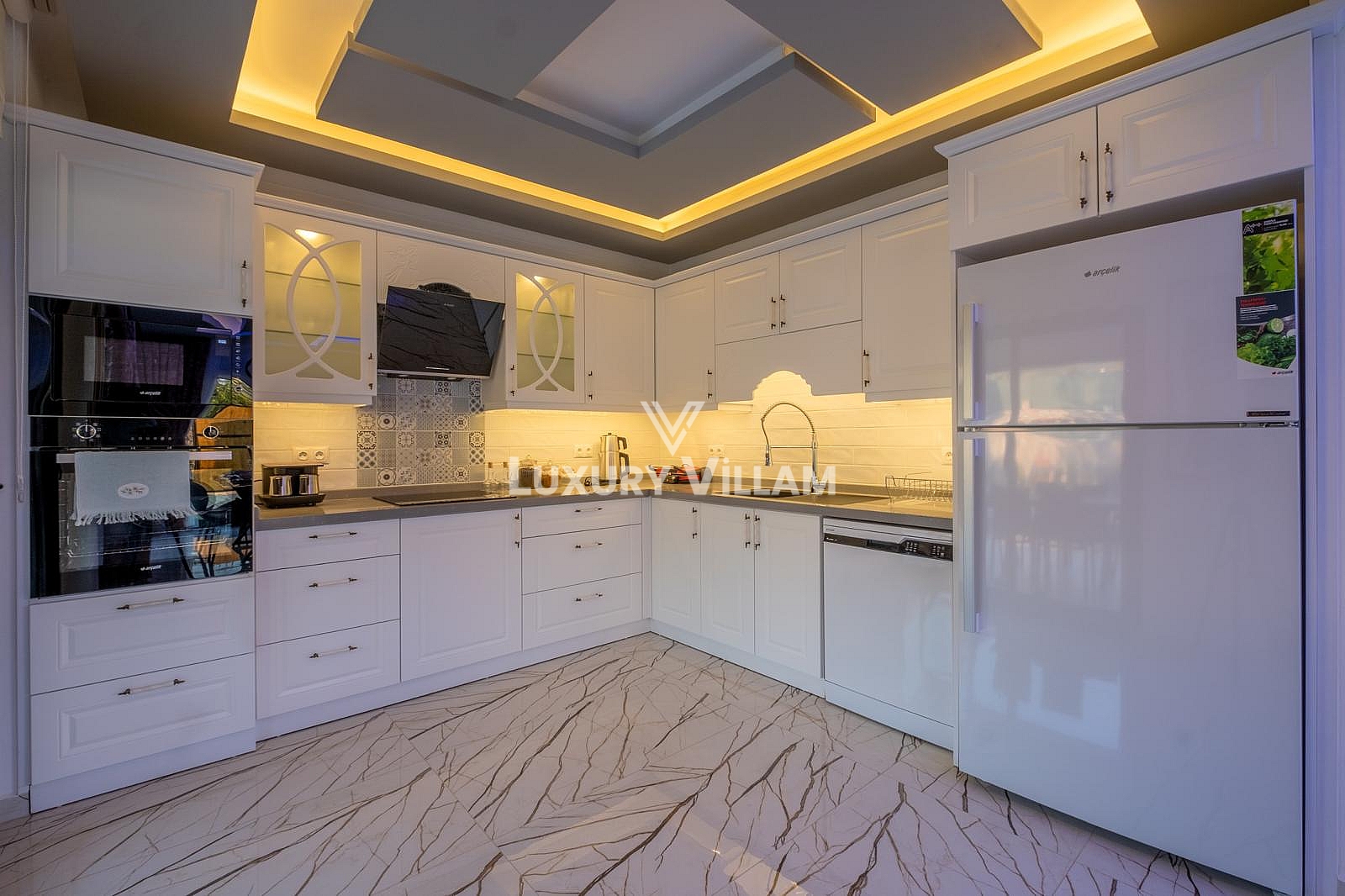 Mutfak : Buzdolabı, Ankastre Fırın, Mikrodalga, Bulaşık Makinesi, 4'lü Elektrikli Ocak, Elektrikli Su Isıtıcısı (Ketıl), Çay Makinesi, Çift Hazneli Kahve Makinesi, Tost Makinesi, Mini Mutfak Robotu, Çatal ve Bıçak Takımı, Kahvaltı ve Yemek Takımı, Tava, Tenccere, 6 Kişilik Epoksi Masası ve Sandalyeleri ve temel mutfak malzemeleri bulunmaktadır.