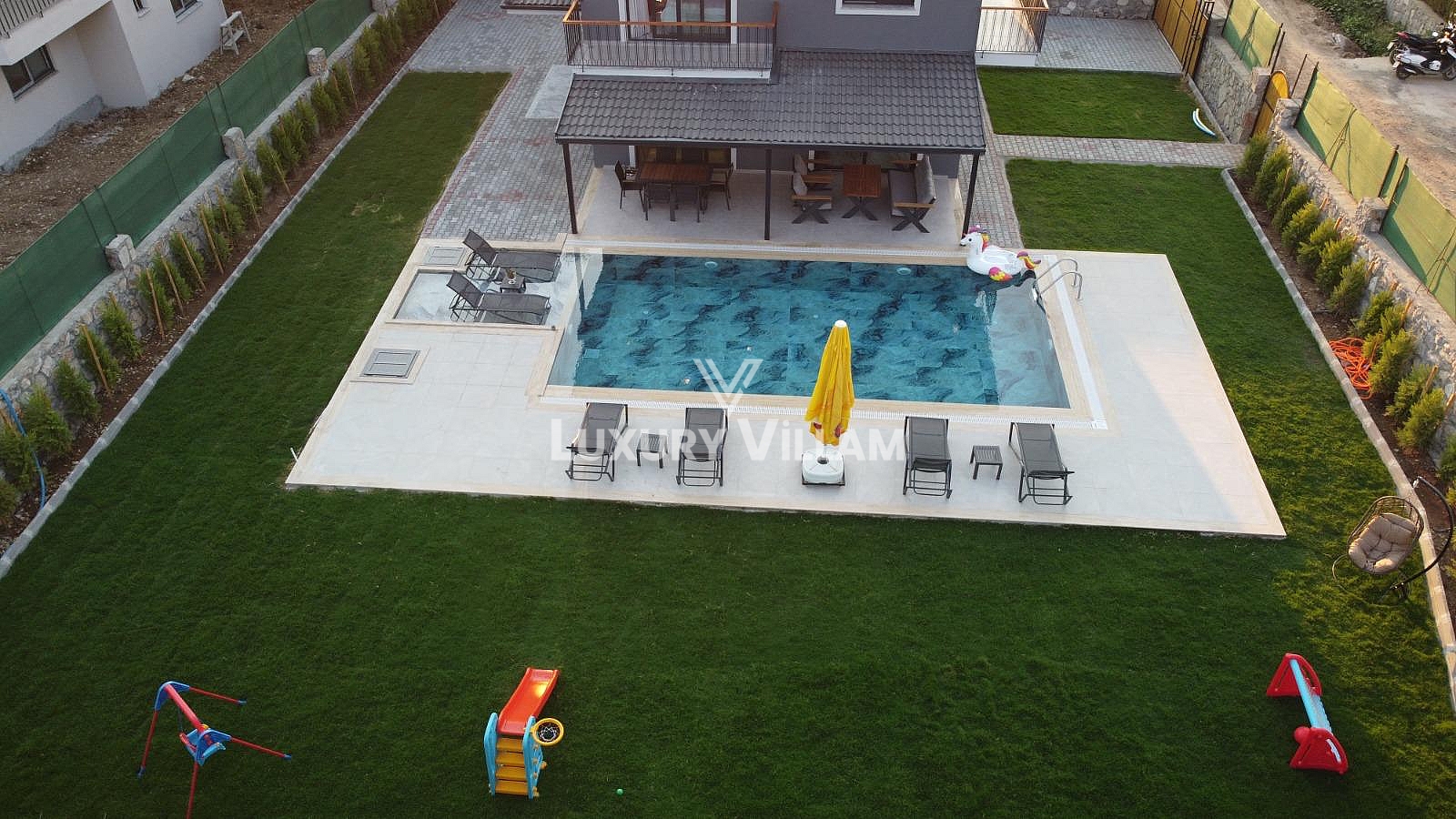 Bahçe : 6 adet Şezlong, Güneş Şemsiyesi, Oturma Grubu ve Sehpası, 6 Kişilik Yemek Masası ve Sandalyeleri, Salıncak ve Kale bulunmaktadır.